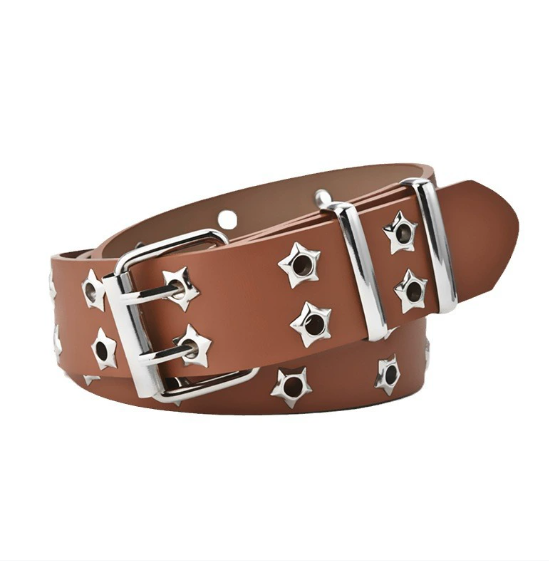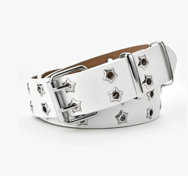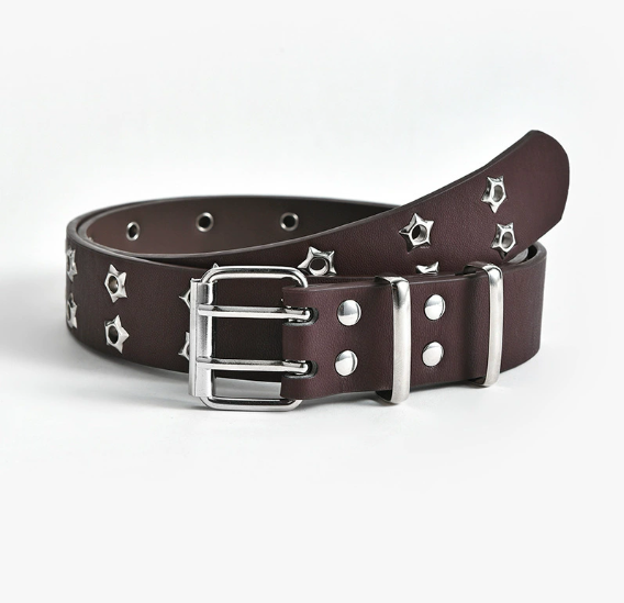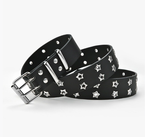 เข็มขัดหมุดตาดาวแบบใหม่สำหรับทุกเพศพร้อมหัวเข็มขัดคู่สไตล์พังค์แฟชั่นหนัง PU ลำลองเข็มขัดสำหรับกางเกงยีนส์