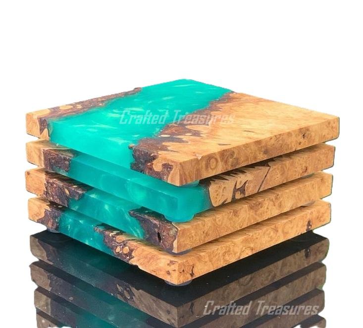 ชุดถาดรองแก้วทำจากไม้อีพ็อกซี่ทรงกลมทรงสี่เหลี่ยมพร้อมที่จับปรับแต่งได้4ชิ้น