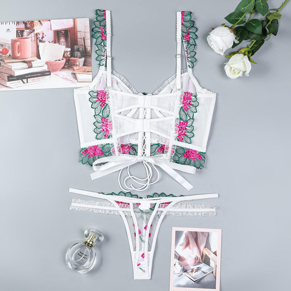เซ็ตชุดชั้นในปักลายดอกไม้ซีทรูเซ็กซี่สีตัดกัน