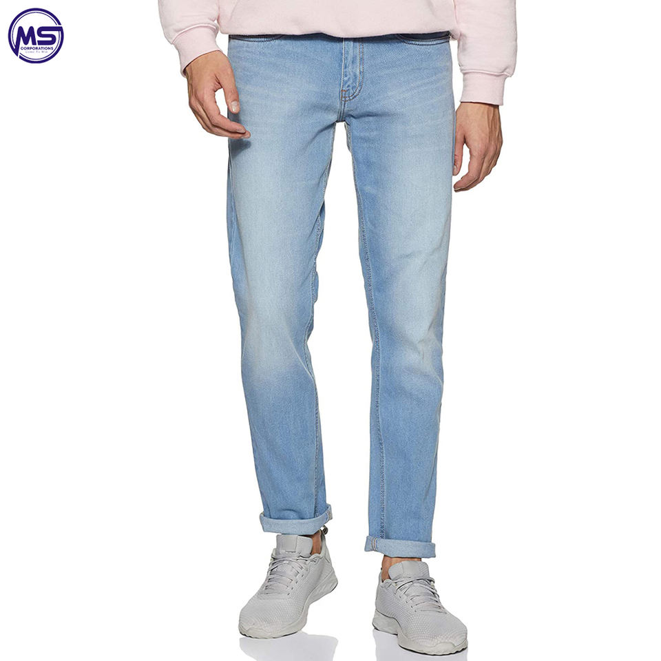 กางเกงผ้ายีนส์ของผู้ชายกางเกงผ้าเดนิมน้ำหนักเบาผ้าถักสีฟ้าสำหรับใส่กลางแจ้งดีไซน์ออกแบบได้ตามที่ต้องการ