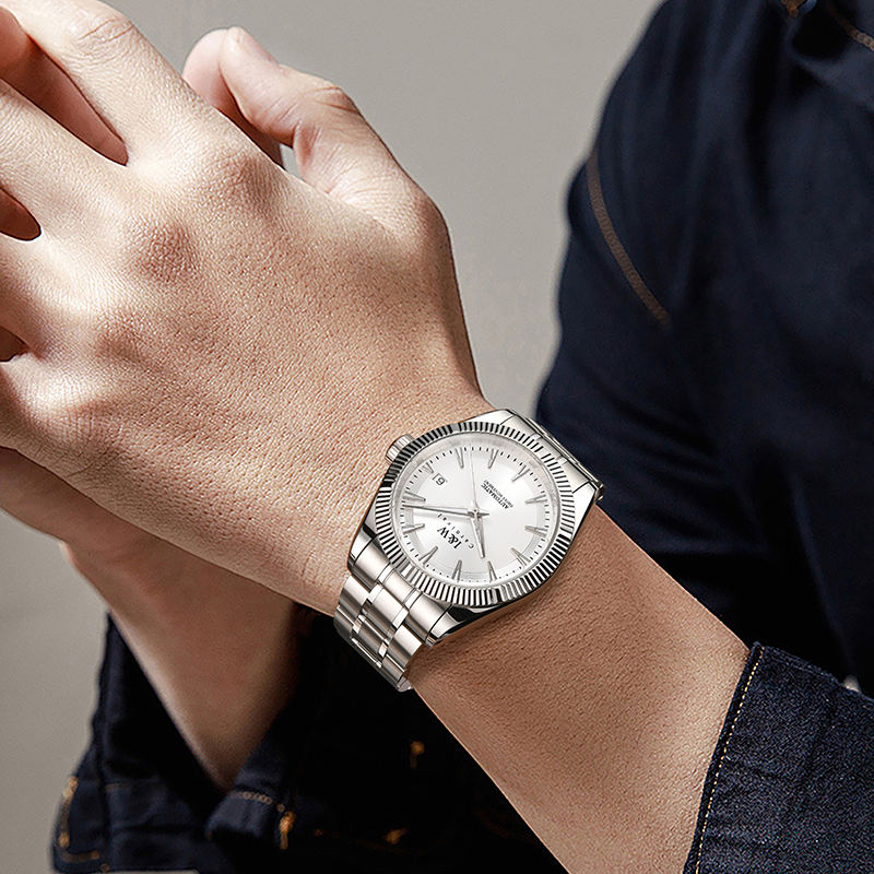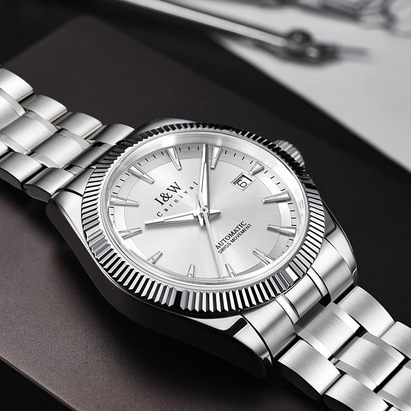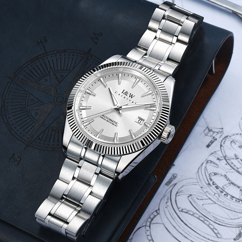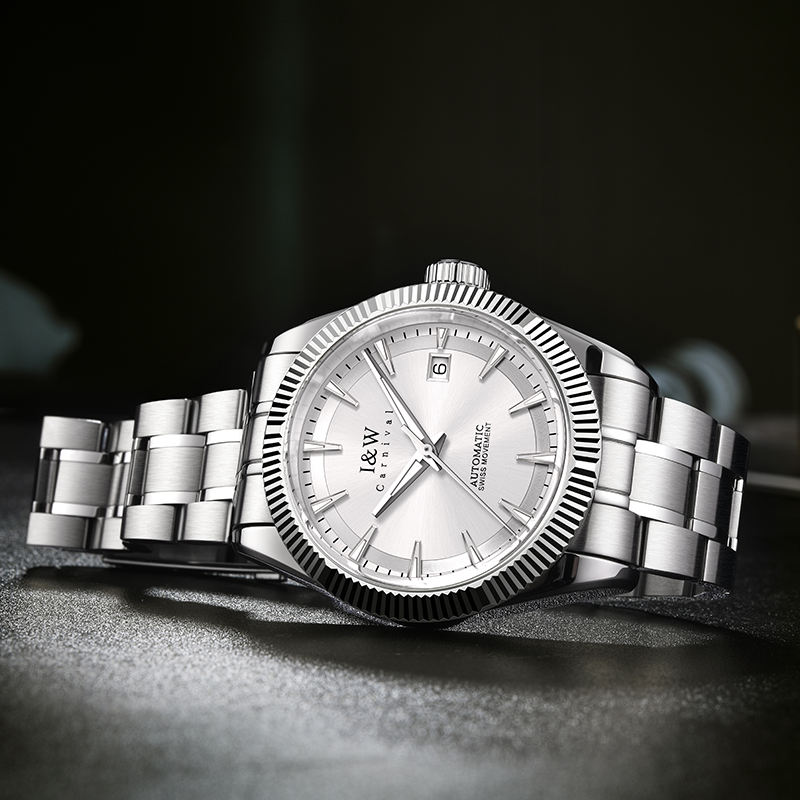 นาฬิกาข้อมือผู้ชาย I&W ระบบออโตเมติก ลดราคาพิเศษ ขอบหน้าปัดแบบฟลูเต็ด เครื่องสวิส ตัวเรือนสแตนเลส สไตล์ธุรกิจ นาฬิกาจักรกล