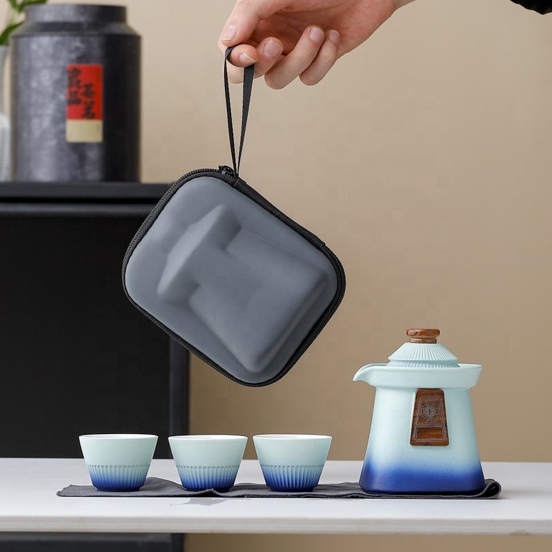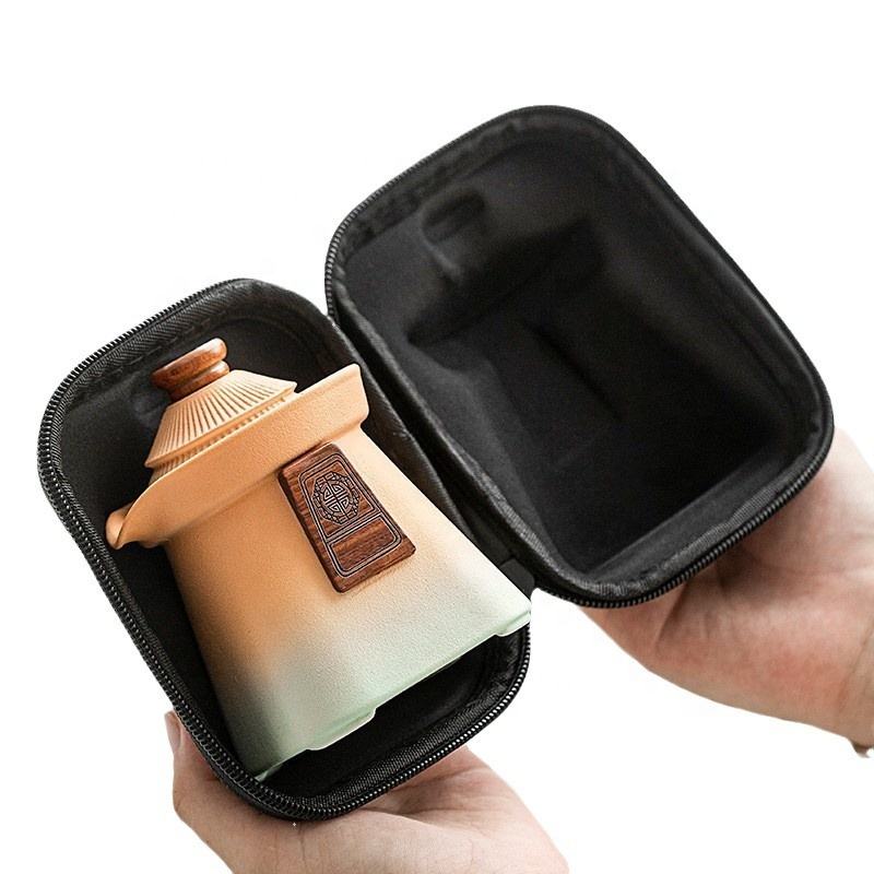 ชุดถ้วยและหม้อชาเซรามิกกงฟูแบบพกพาสำหรับการเดินทางกลางแจ้งพร้อมถุงใส่ชุดชาและกาแฟ