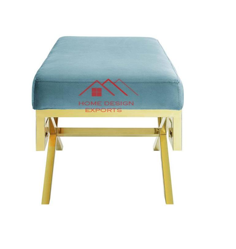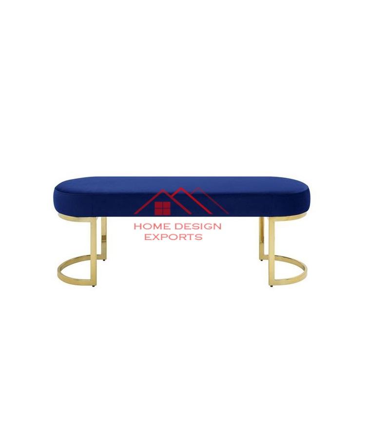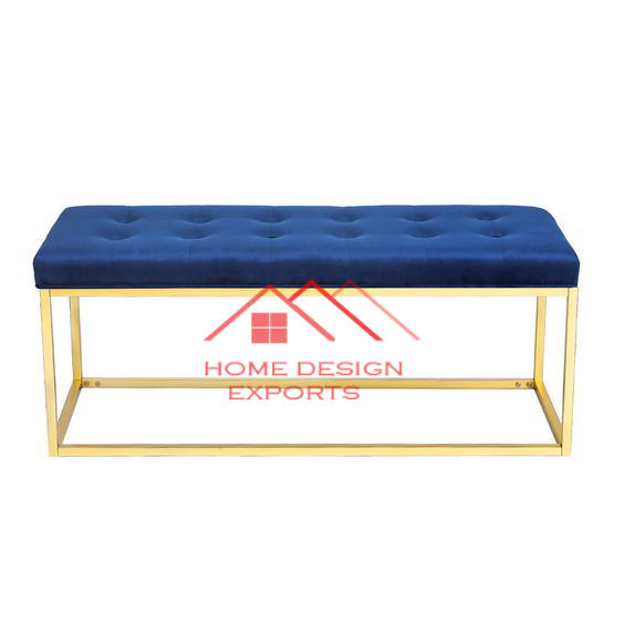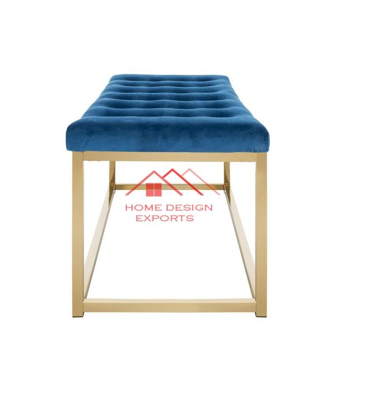 ม้านั่งโมเดิร์นหุ้มผ้าสีน้ำเงินสำหรับโรงแรม พร้อมขาเหล็กสแตนเลสสีทอง ลดราคาพิเศษ