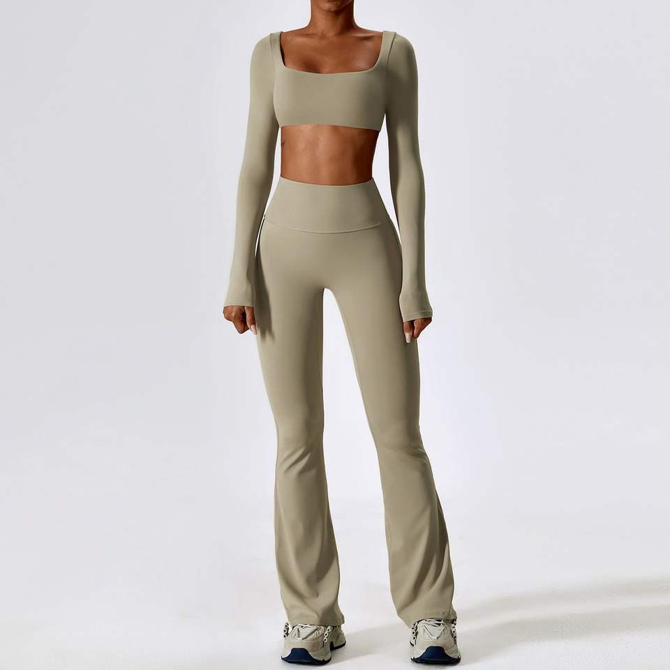 ชุดโยคะ2ชิ้นแขนยาวสำหรับผู้หญิงเสื้อผ้าฟิตเนสขนาดกลางพิมพ์โลโก้เอวด้านหน้า