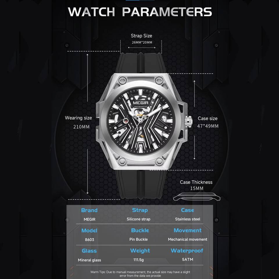 Megir นาฬิกาอัตโนมัติหรูหราใหม่8603นาฬิกากลไกจักรกลนาฬิกาซิลิโคนทันสมัยทันสมัยนาฬิกาผู้ชาย2025