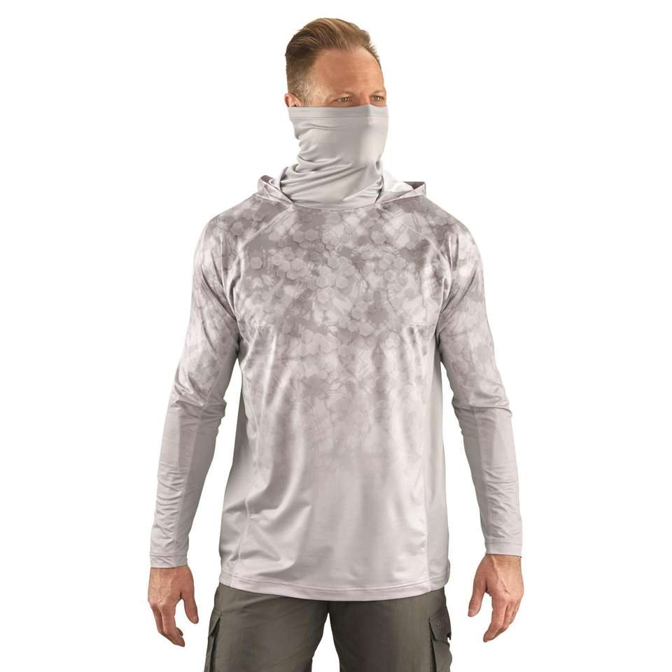 เสื้อตกปลาผู้ชาย UPF 50 + ลายพรางปลาแห้งเร็วพร้อมฮู้ดและที่คลุมใบหน้าออกแบบโลโก้ได้ตามต้องการสำหรับผู้ใหญ่