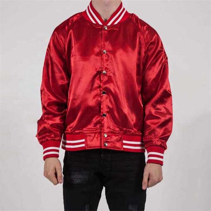 แจ็คเก็ตเบสบอลผ้าซาตินคุณภาพสูงสำหรับผู้ชาย ลดราคาพิเศษ สไตล์วาร์ซิตี้แนวสตรีท คอตั้ง สีพื้น แจ็คเก็ตบาง