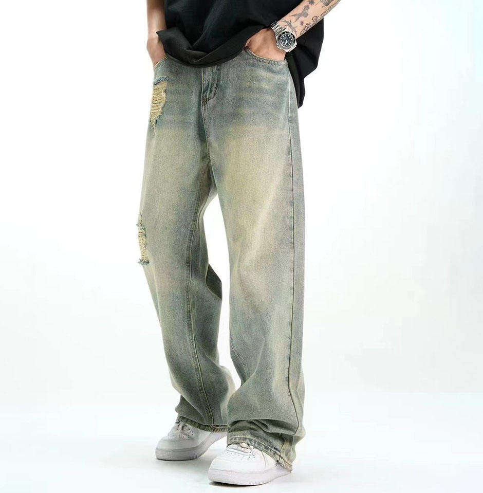 กางเกงยีนส์สโตนวอชของผู้ชายขายดีกางเกงยีนส์ขายาวมีคุณภาพสูงกางเกงยีนส์ทรงตรงสไตล์สตรีทแวร์สีเข้มกลางฤดูร้อน