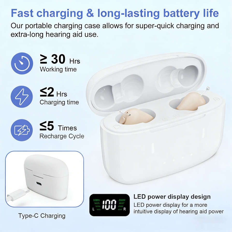 เวลาในการชาร์จ:เครื่องช่วยฟัง≤1.5 ชม.; กล่องชาร์จ 2 ชม.