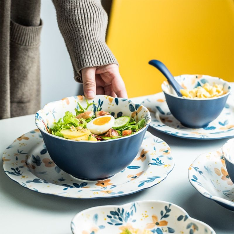 ชุดชามและจานเซรามิกลายดอกไม้สีฟ้าแบบนอร์ดิกชุดรับประทานอาหารสุดหรูทันสมัย