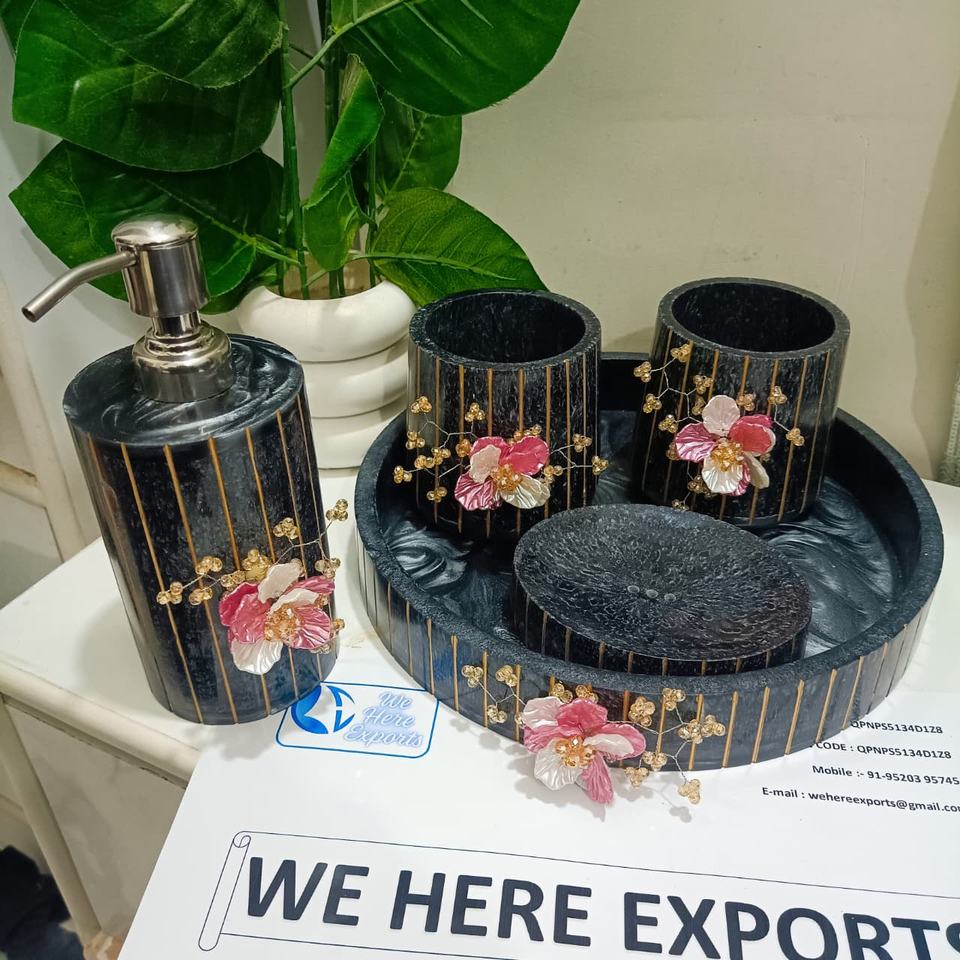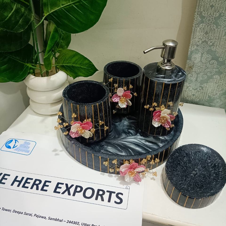 ชุดห้องน้ำทำจากเรซิ่นสมัยใหม่สำหรับตกแต่งห้องน้ำมีตัวจ่ายโลชั่นและถาดวางแก้ว