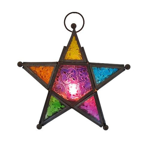 แก้วกระจกสีทรงห้าเหลี่ยมสำหรับใส่เทียนของโมร็อกโกโคมไฟเหล็กย้อนยุคสำหรับบ้านโรงแรมบาร์ของตกแต่งงานแต่งงาน