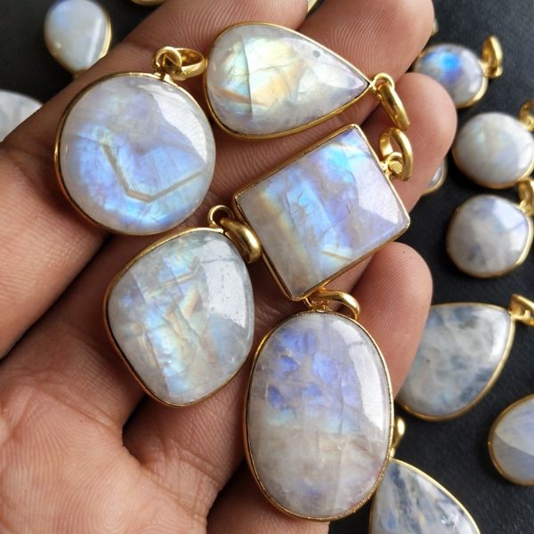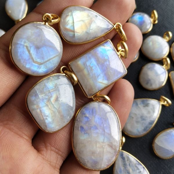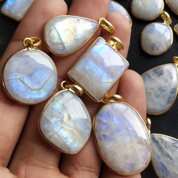 ร้อนขายธรรมชาติ Labradorite มูนสโตนจี้หินห่อจี้หินจี้ทองที่เต็มไปด้วยมูนสโตนลูกปัดสีดำ Penda