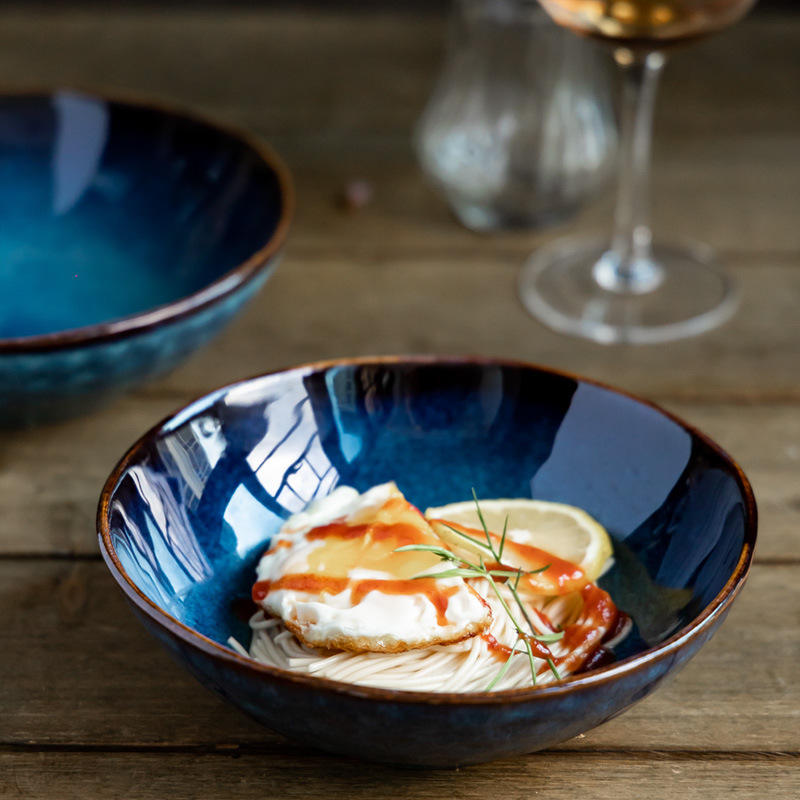 ชุดอาหารค่ำโบนไชน่าใหม่ลดราคาพิเศษ สีน้ำเงินเคลือบลายแตกแบบสร้างสรรค์ เป็นมิตรกับสิ่งแวดล้อม วาดลายด้วยมือ ภาชนะเก็บอาหารพอร์ซเลน สำหรับโรงแรม