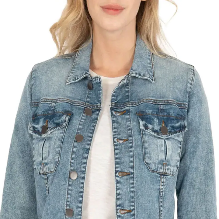 แจ็คเก็ตยีนส์ผู้หญิงทรงทันสมัย ปกคอปก สไตล์ลำลอง สีฟ้าอ่อนฟอก รับผลิตตามแบบ (OEM) ลดราคาพิเศษ