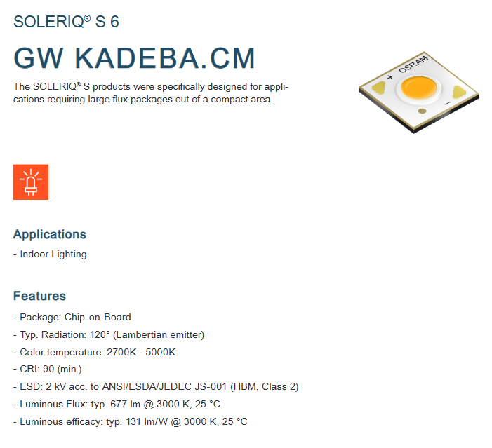 Osrams SOLERIQ S 6 GW kadeba. cm ซีรีส์2700K-5000K 767LM CRI90ให้เลือก5.2W ชิป cob พลังงานสูง