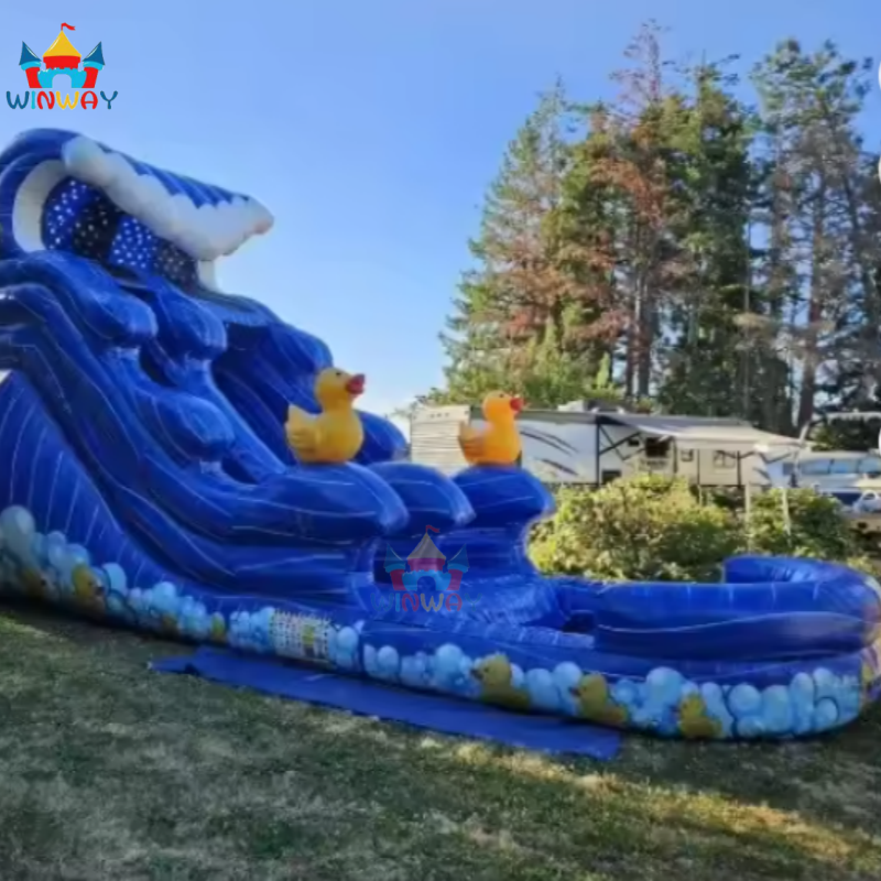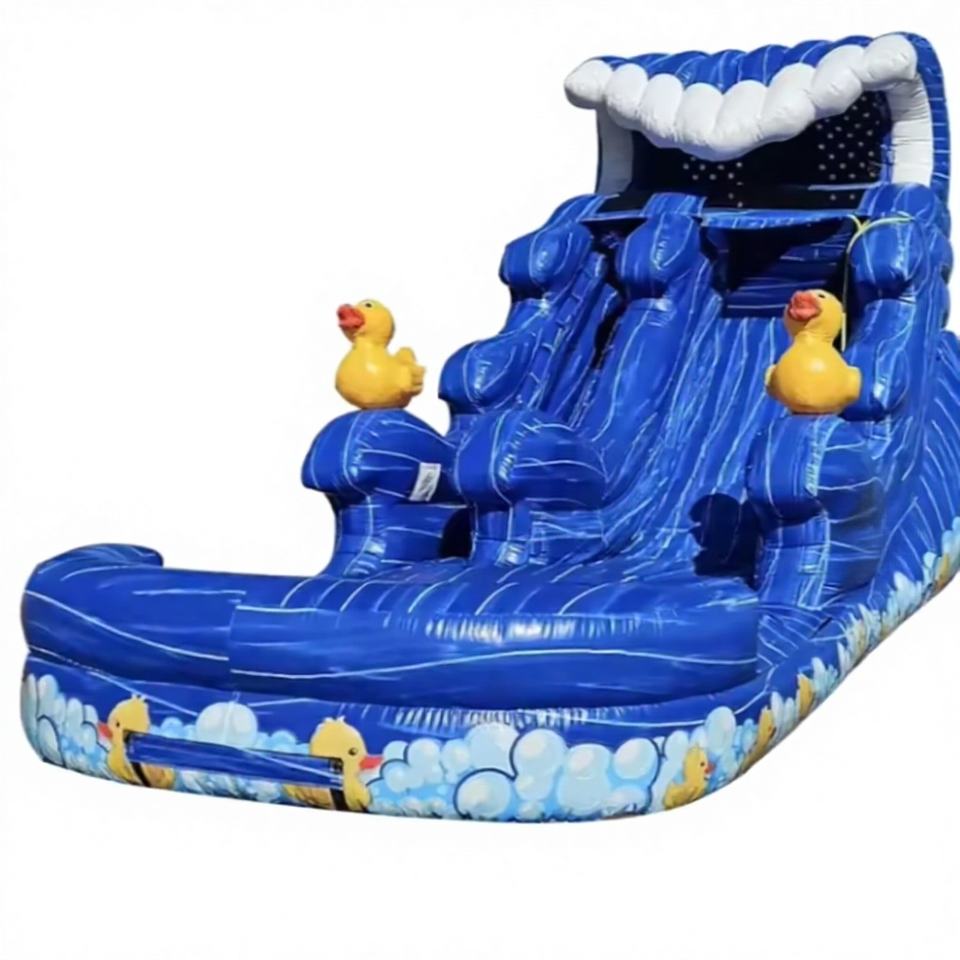 สไลเดอร์น้ำเป่าลม PVC ลายคลื่นสีฟ้ามหาสมุทร พร้อมเป็ดเหลือง สระว่ายน้ำเด็ก ได้รับการรับรองมาตรฐาน CE รับประกัน 3 ปี สำหรับใช้ในบ้าน