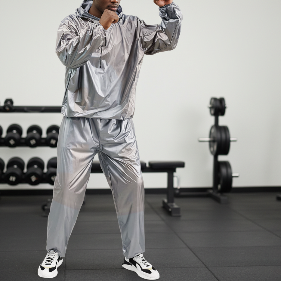 ชุดซาวน่าออกกำลังกาย PVC ลดราคาพิเศษ สำหรับผู้ชายและผู้หญิง เสื้อแจ็คเก็ตและกางเกง ช่วยกระตุ้นการขับเหงื่อ เหมาะสำหรับออกกำลังกายที่บ้าน ลดน้ำหนัก และฟิตเนส