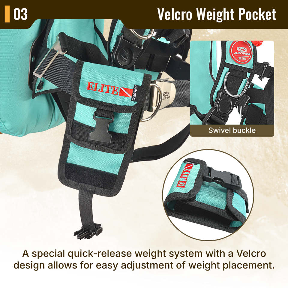 ระบบน้ำหนักแบบบูรณาการ: มีระบบน้ำหนักแบบบูรณาการเพื่อเพิ่มความสบายและความคล่องตัวในการดำน้ำ