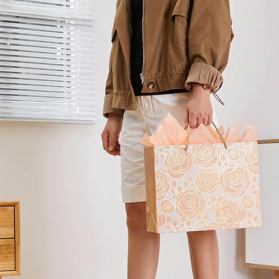 ถุงบรรจุภัณฑ์เสื้อผ้าหรูหราสำหรับขายปลีก โปรโมชั่นลดราคาพิเศษ พิมพ์โลโก้ตามสั่ง เคลือบลามิเนต ทำด้วยมือจากวัสดุรีไซเคิล ผลิตตามสั่ง
