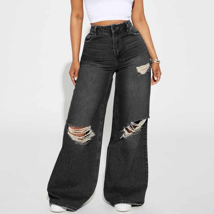 กางเกงยีนส์สไตล์เรโทรขายดีสำหรับผู้หญิง รับผลิตตามแบบ กางเกงคาร์โก้ขาบาน ระบายอากาศได้ดี ผ้ายีนส์ขาดๆ เอวสูง