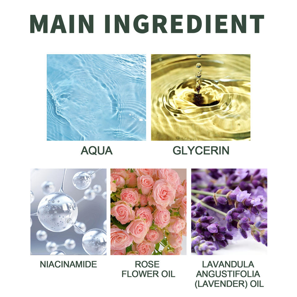 ส่วนผสม:Aqua, glycerin, Niacinamide, น้ำมันดอกกุหลาบ, Lavandula angustifolia