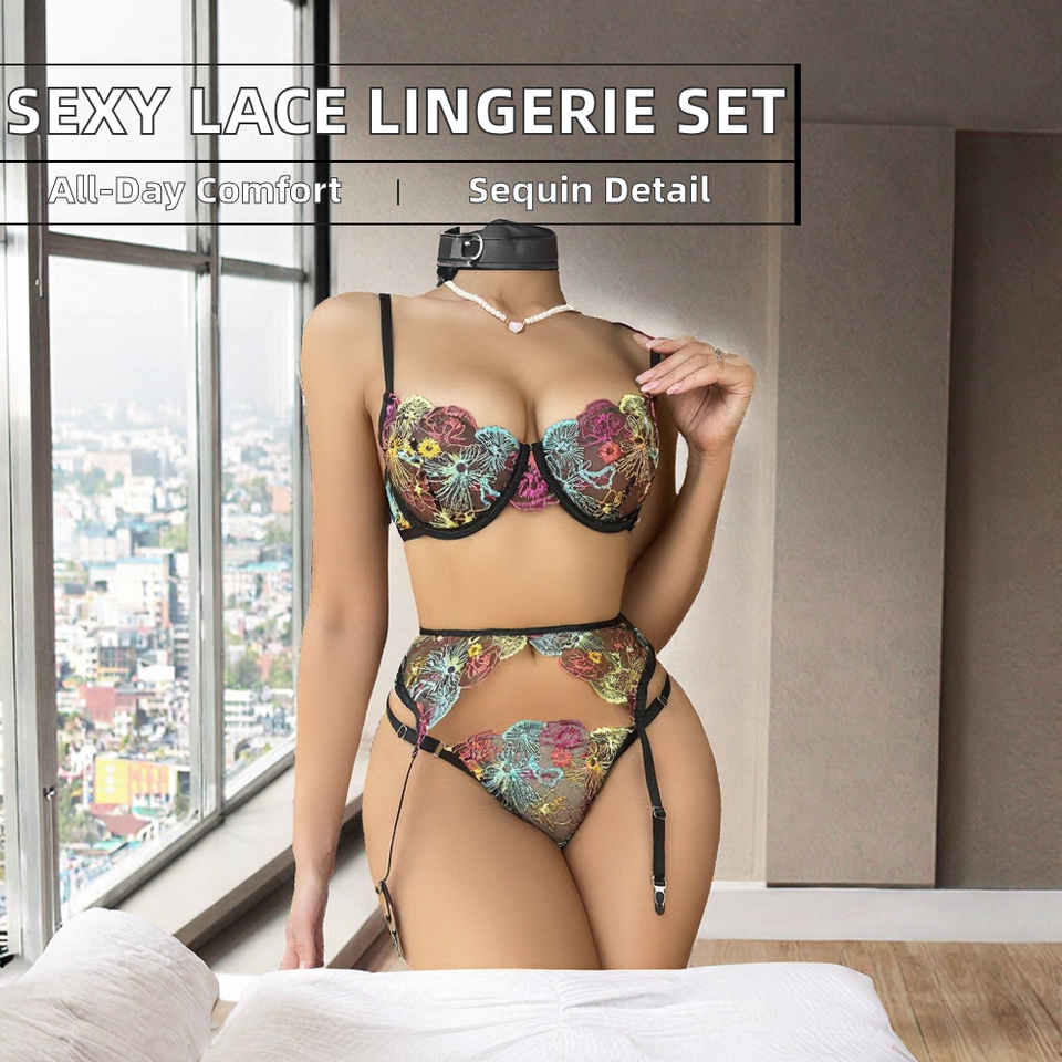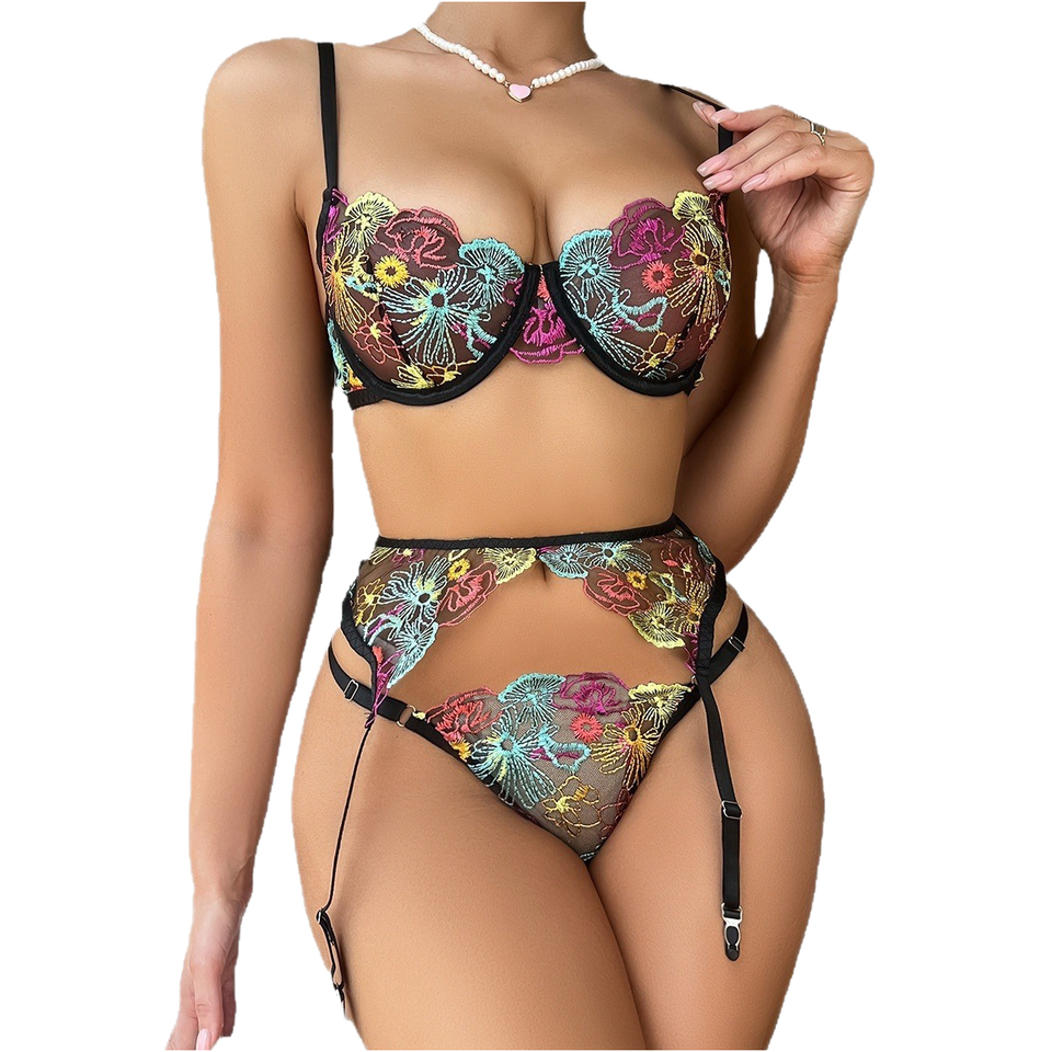 ชุดชั้นในเซ็กซี่แบบสามชิ้น รุ่น EC1003S ผ้าลูกไม้โปร่งแสง ปักลายสวยงาม ระบายอากาศได้ดี สายคล้องคอ ไม่มีโครงเหล็ก ลดราคาสุดฮอต
