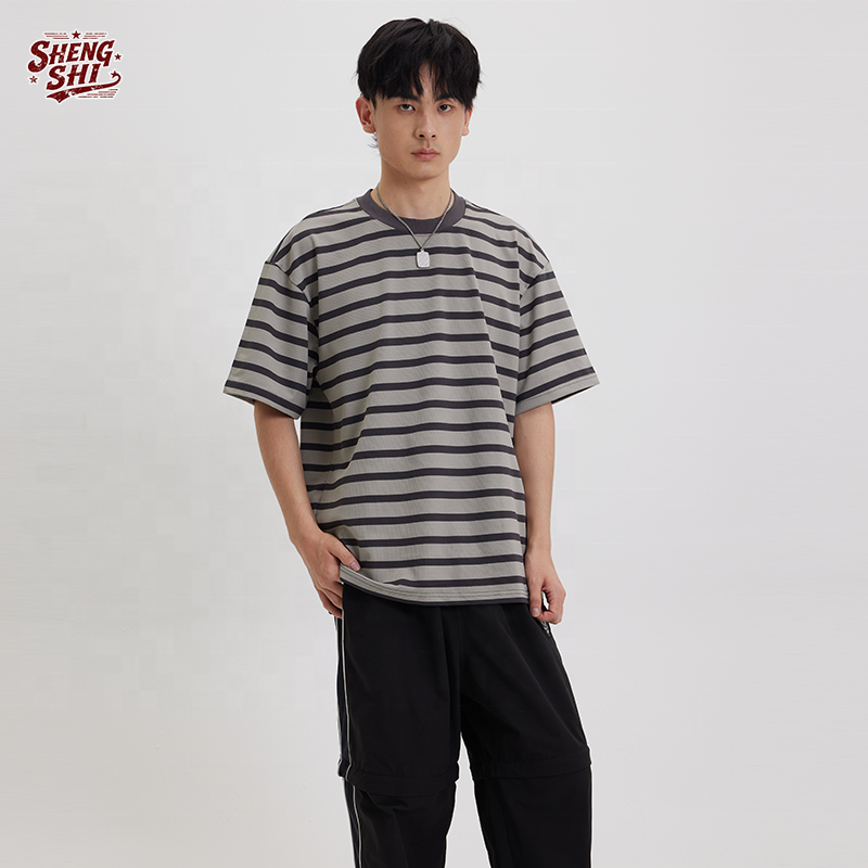 เสื้อยืดคอกลมแขนสั้นสำหรับวัยรุ่น250Gsm ผ้าฝ้ายลายทางแบบแห้ง
