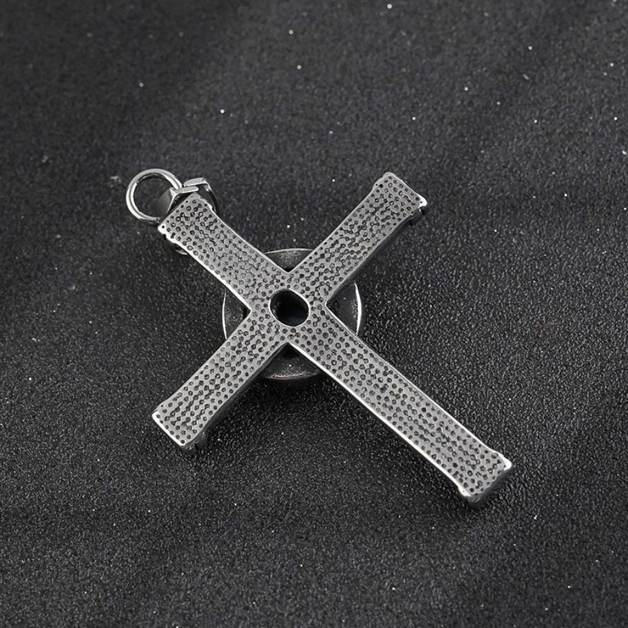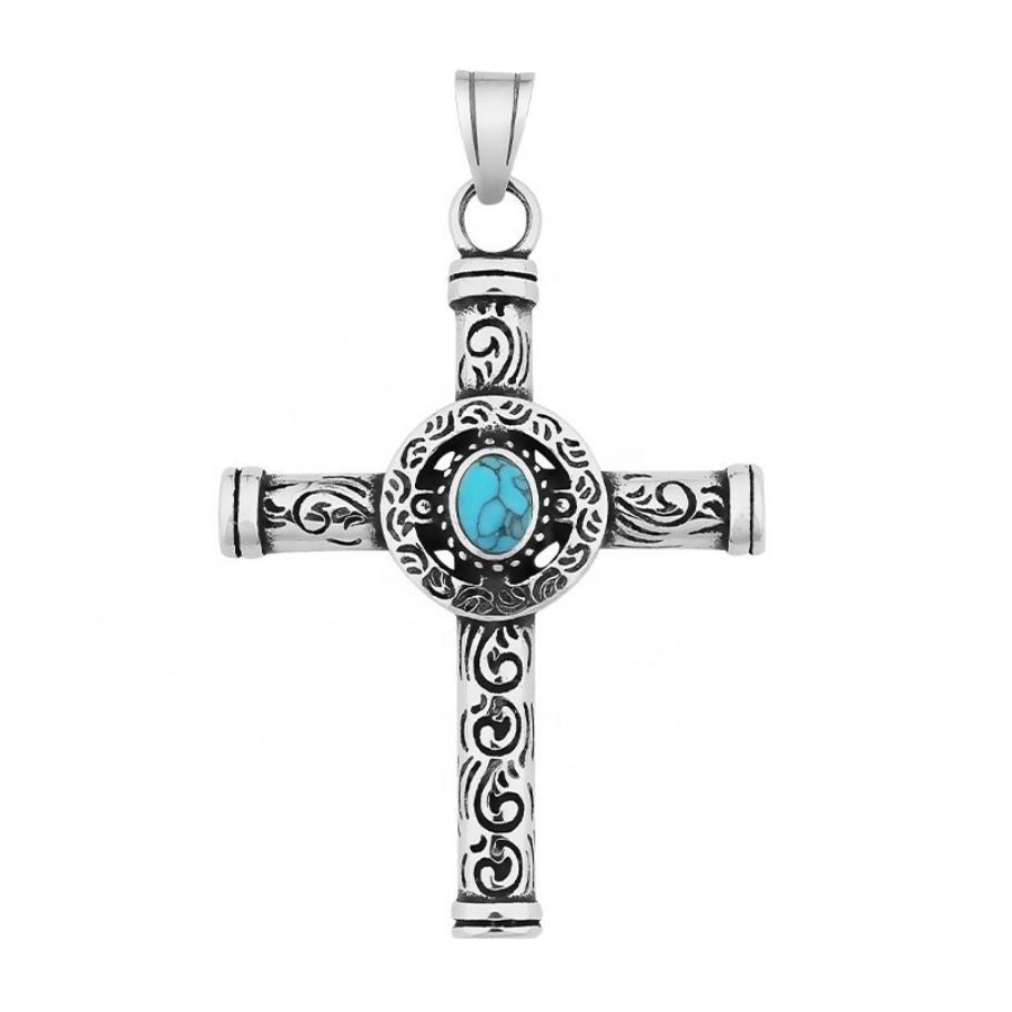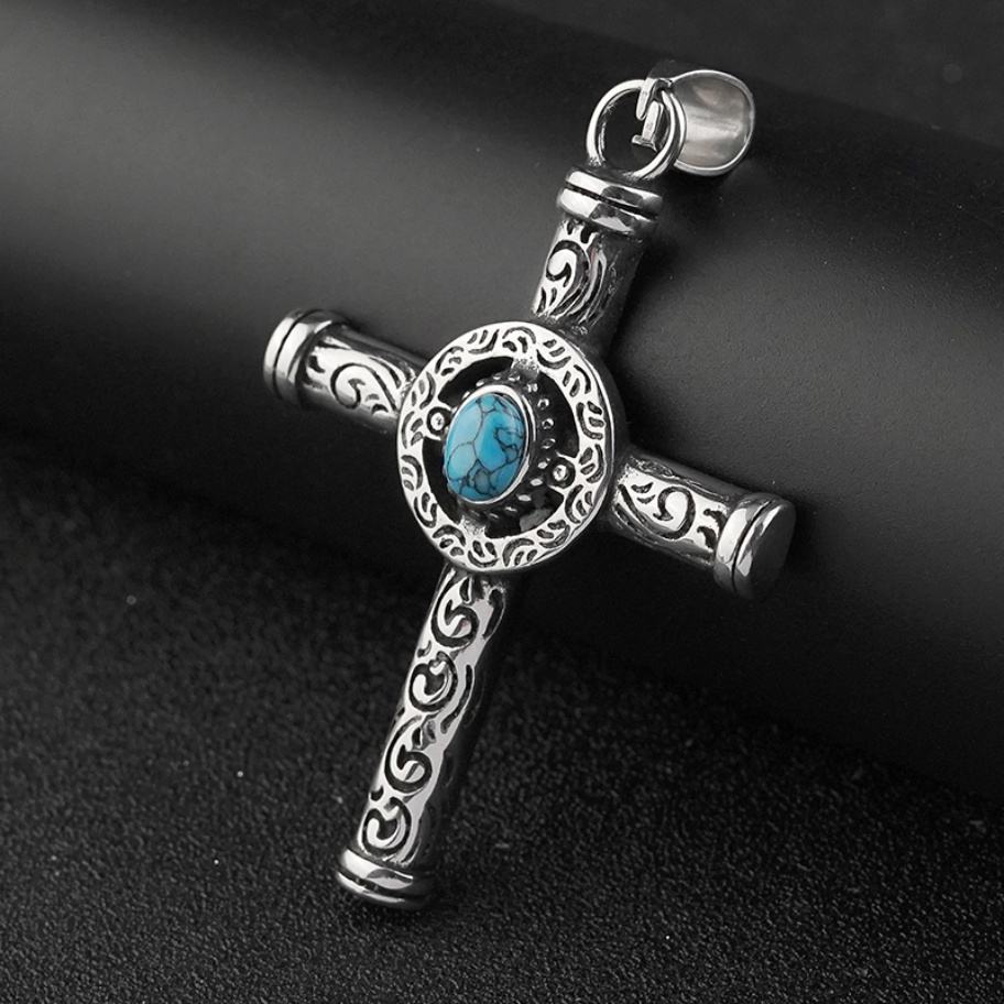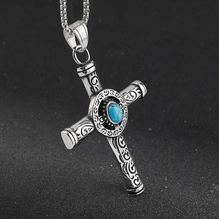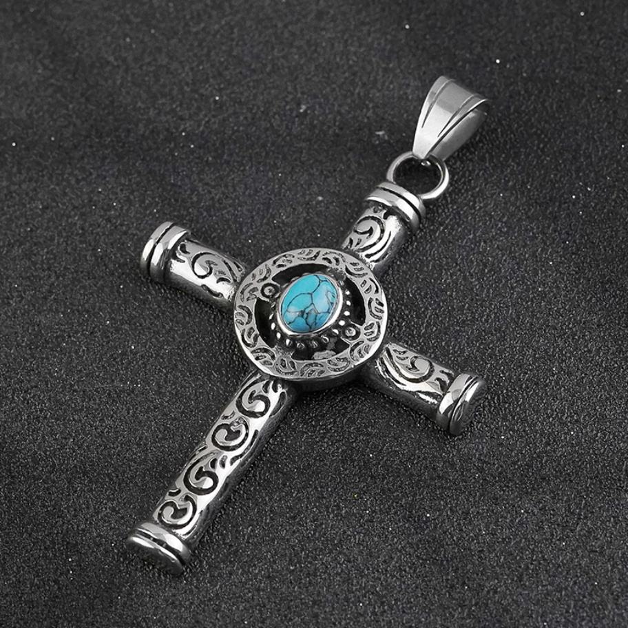 สร้อยคอจี้รูปกางเขนคริสเตียนประดับด้วยหินเทอร์ควอยซ์ธรรมชาติสไตล์วินเทจย้อนยุค ทำจากสแตนเลสสตีล ลดราคาพิเศษสำหรับผู้ชาย