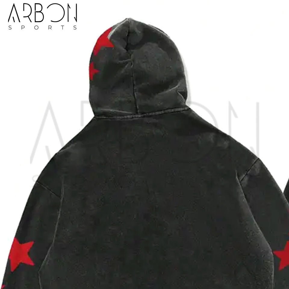 เซ็ตสองชิ้นลำลองสไตล์สตรีทเสื้อมีฮู้ดพิมพ์ภาพบุคคลจับคู่กับกางเกงสเวตเตอร์ที่มีเชือกผูกสีตัดกันสำหรับผู้ชาย