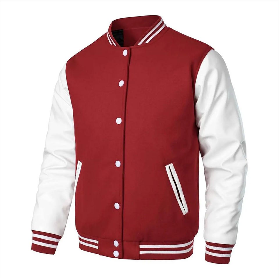 เสื้อแจ็คเก็ตวาร์ซิตี้สตรีทแวร์สำหรับผู้ชาย สีแดงเลือดหมู แขนสีขาว คอตั้ง ปักโลโก้ด้านหน้า ติดกระดุม ลดราคาพิเศษ