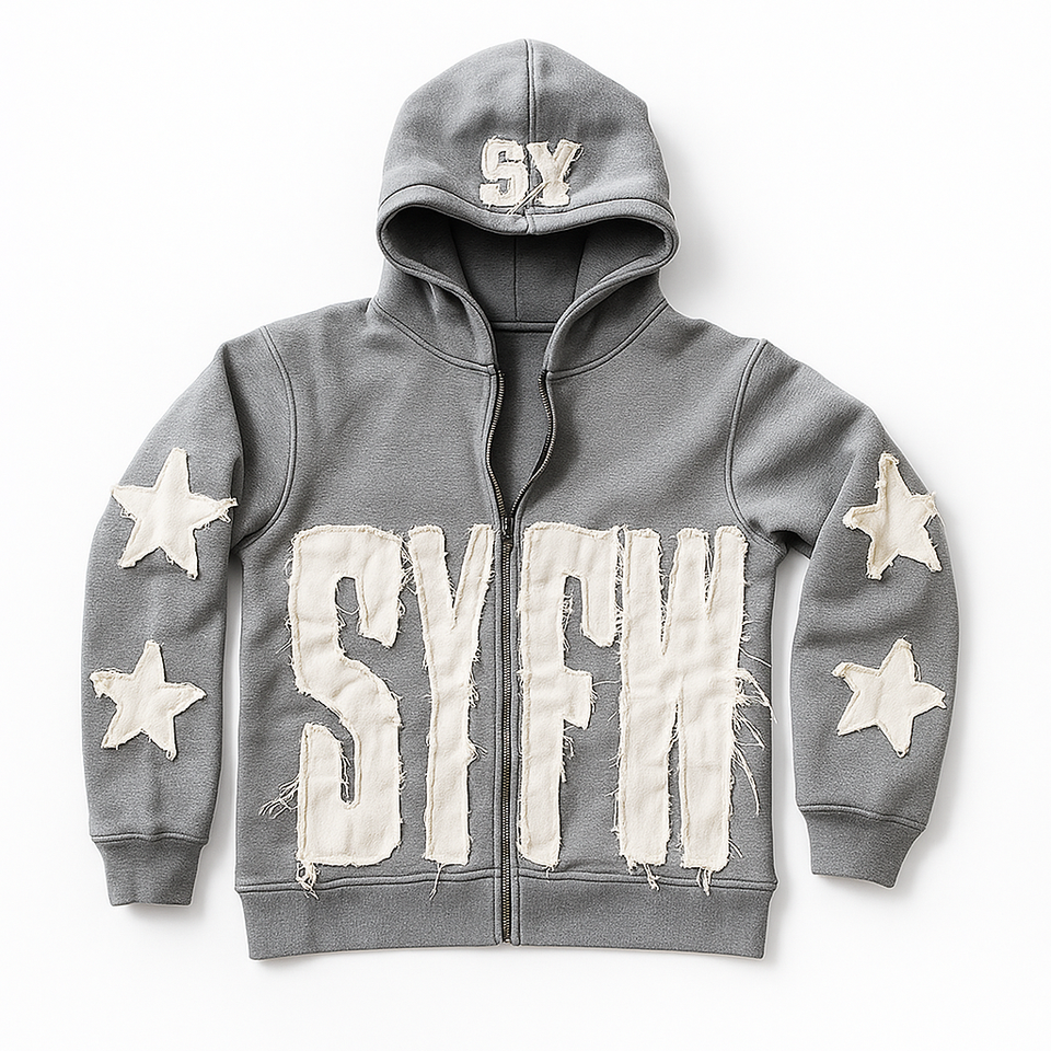 เสื้อฮู้ดดี้ผู้ชายสไตล์สตรีทแวร์ทรงโอเวอร์ไซส์ ซิปหน้า ปักโลโก้ตามสั่ง งานปักแบบดิสเทรส ขายส่งจากโรงงาน ราคาพิเศษ