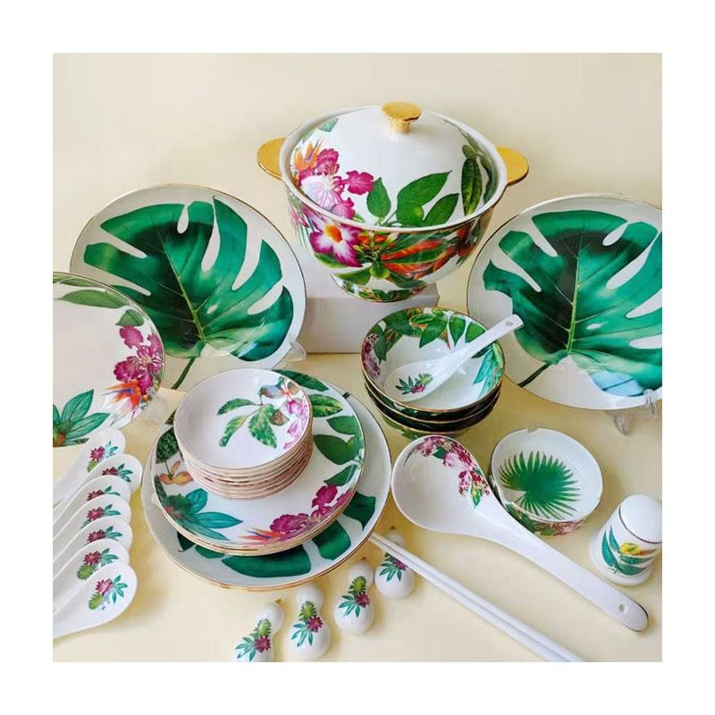 ชุดจานชามเซรามิกลายป่าฝนเขตร้อนชุดเครื่องใช้บนโต๊ะอาหาร