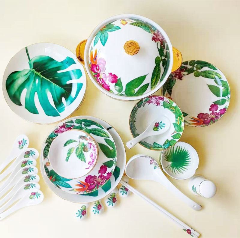 ออกแบบ:ชุดอาหารเซรามิกโบนไชน่าลายป่าฝนเขตร้อน