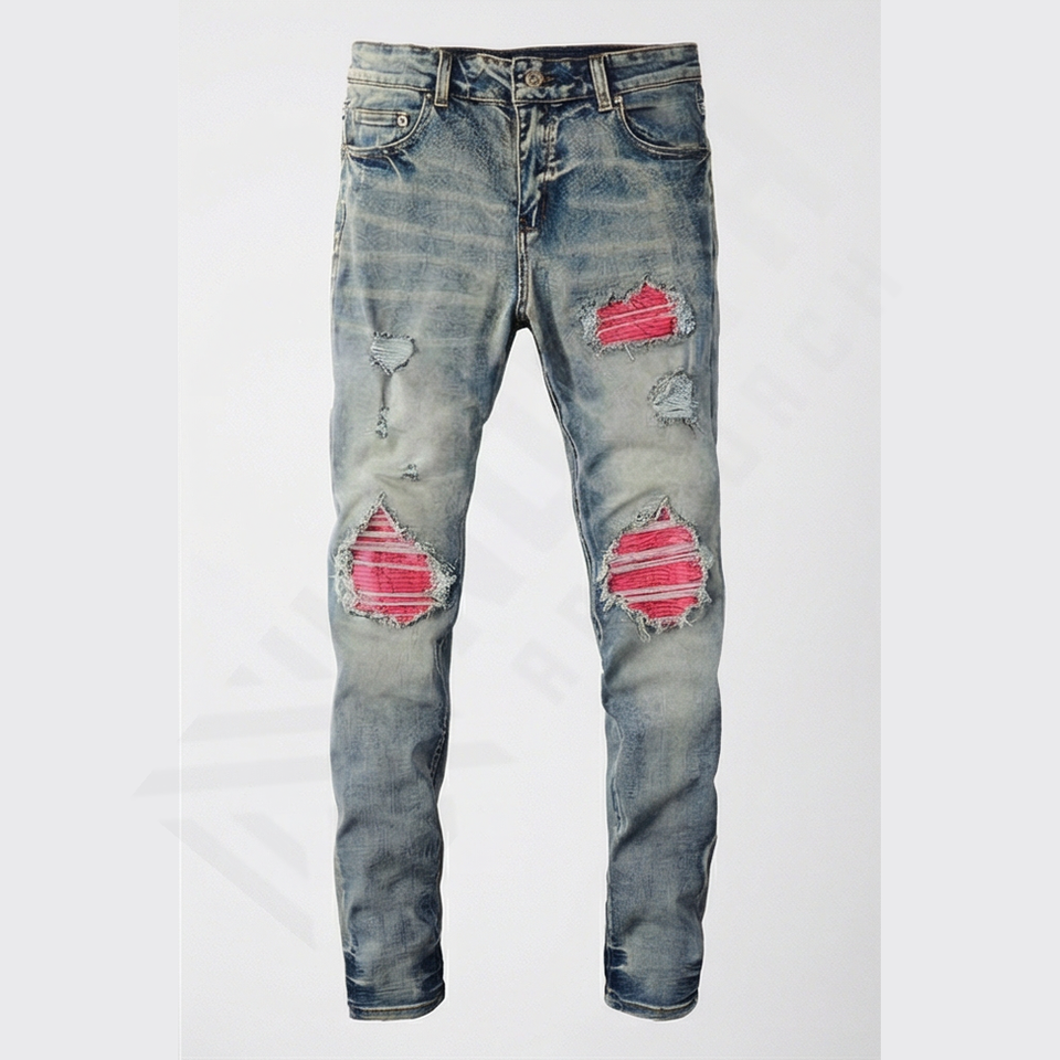 กางเกงยีนส์ผู้ชายทรงสกินนี่สไตล์วินเทจ ขาดๆ แต่งปักลายสีชมพู ราคาส่ง ขายส่ง กางเกงยีนส์สตรีทแวร์