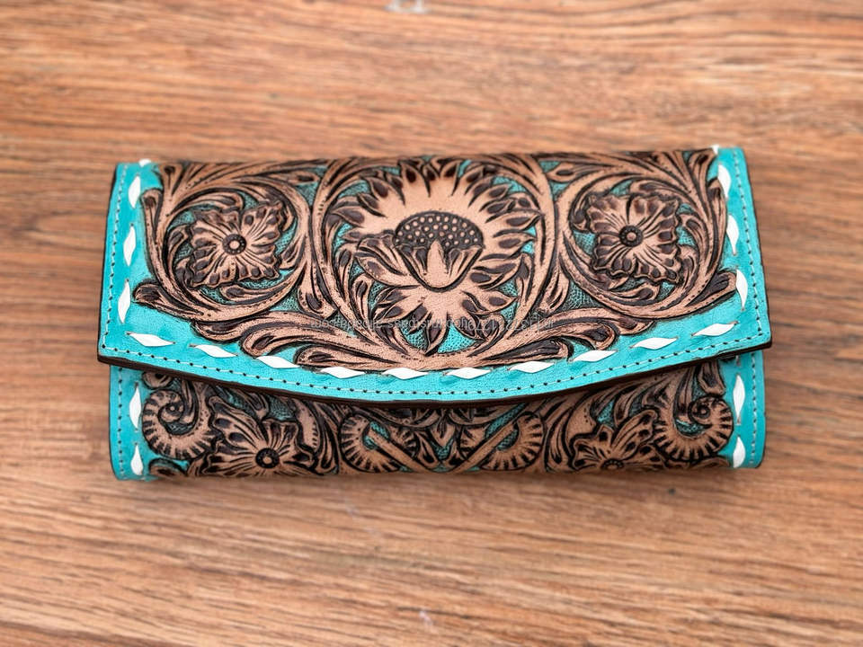 กระเป๋าสตางค์แฟชั่นสไตล์ตะวันตกสำหรับผู้หญิงกระเป๋าสตางค์หนังแท้สลักลายด้วยมือคุณภาพสูง