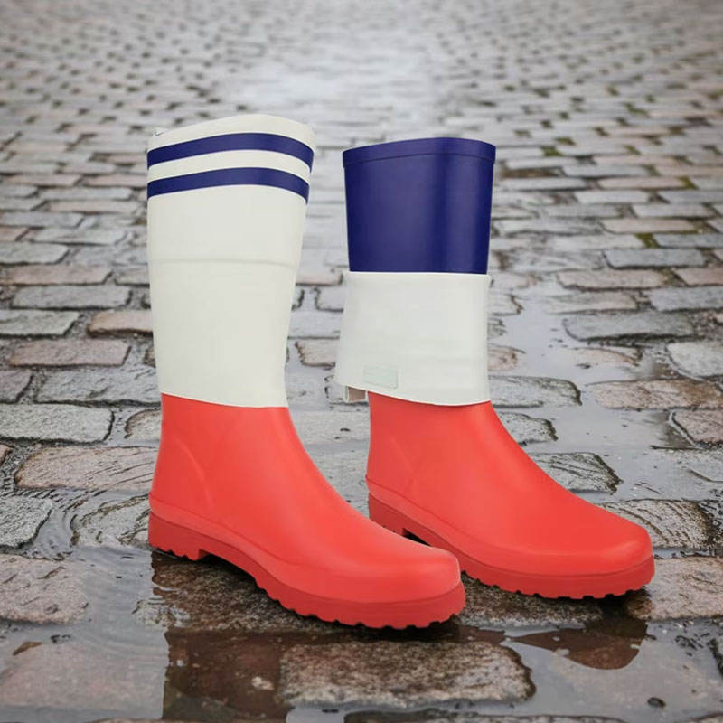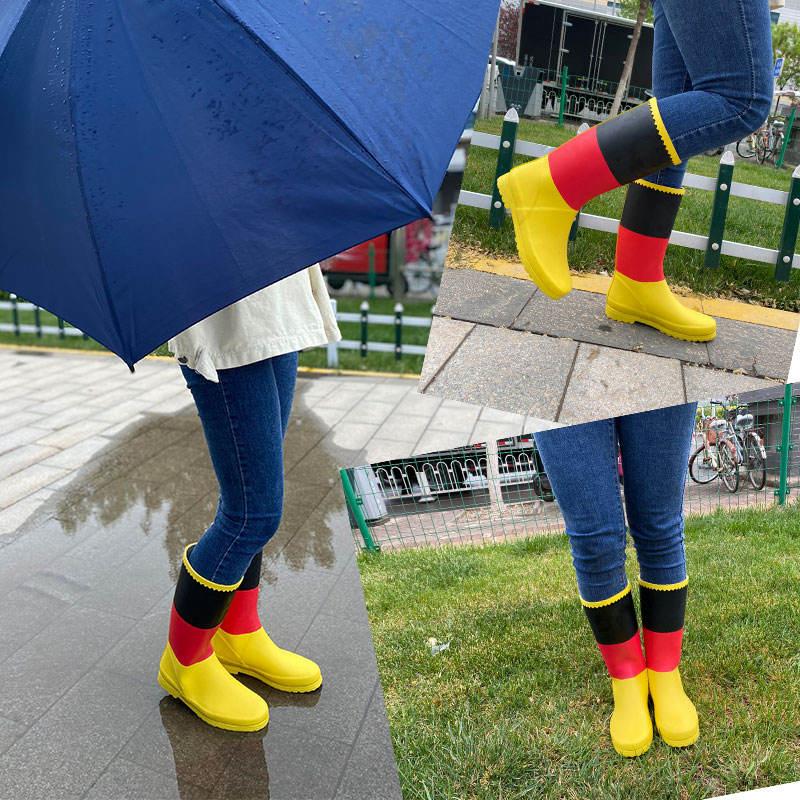 รองเท้าบูทเวลลิงตันทรงกลางสำหรับผู้หญิง ลดราคาสุดฮอต ดีไซน์ลายธงแฟชั่น กันน้ำ ทำจากยาง เหมาะสำหรับฤดูใบไม้ผลิ ฤดูร้อน ฤดูหนาว และฤดูใบไม้ร่วง