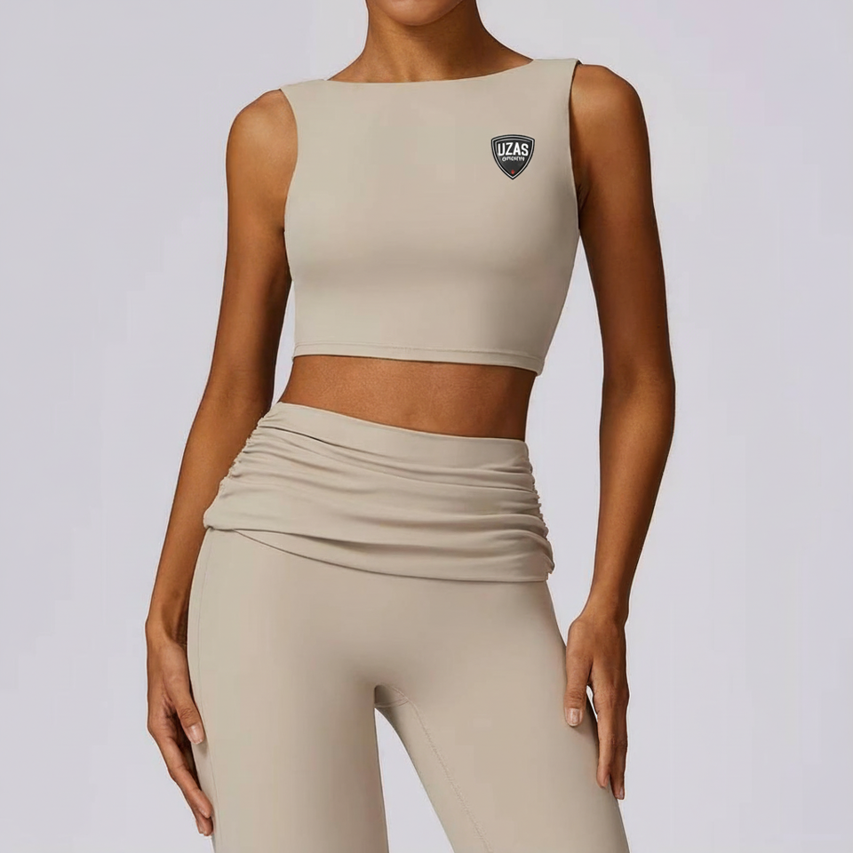 เสื้อครอปแขนกุดไร้ตะเข็บสำหรับผู้หญิง ขายดี ชุดออกกำลังกายโยคะ UZAS SPORTS ขายส่ง ด้านหน้าสั้น โลโก้ แห้งเร็ว ระบายอากาศได้ดี