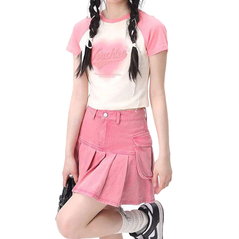 กระโปรงสั้นของผู้หญิงกระโปรงสั้นแบบคาร์โก้เกาหลีกระโปรงผ้ายีนส์แนว Y2K ชายกระโปรงเอวสูงสีชมพูแบบวินเทจ