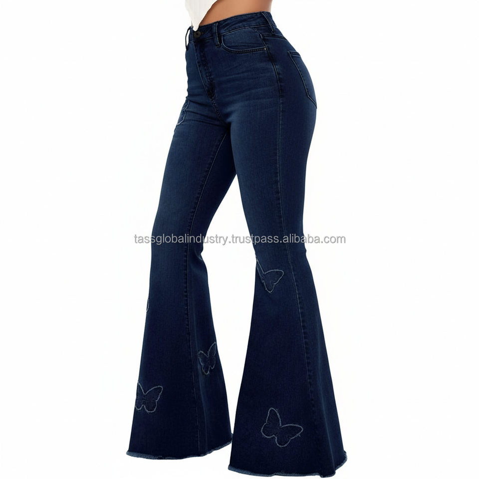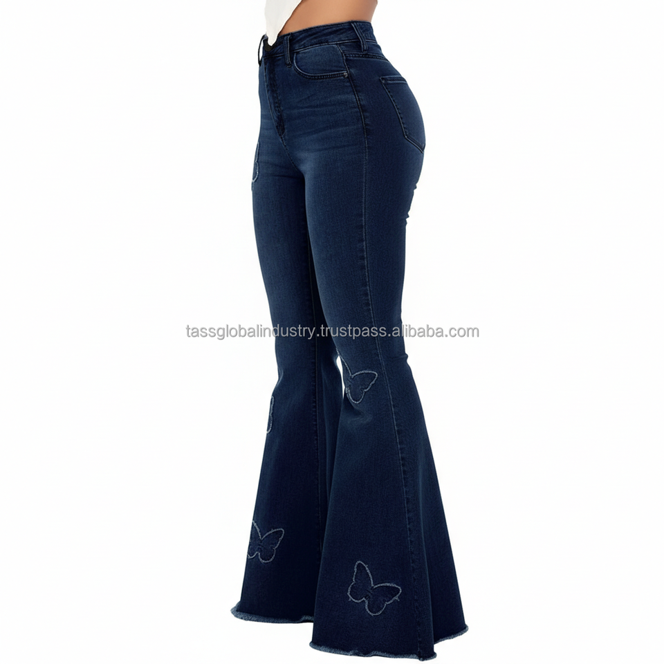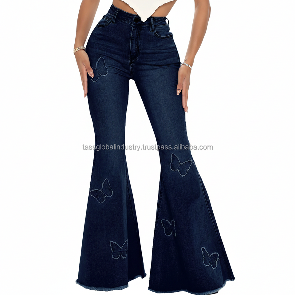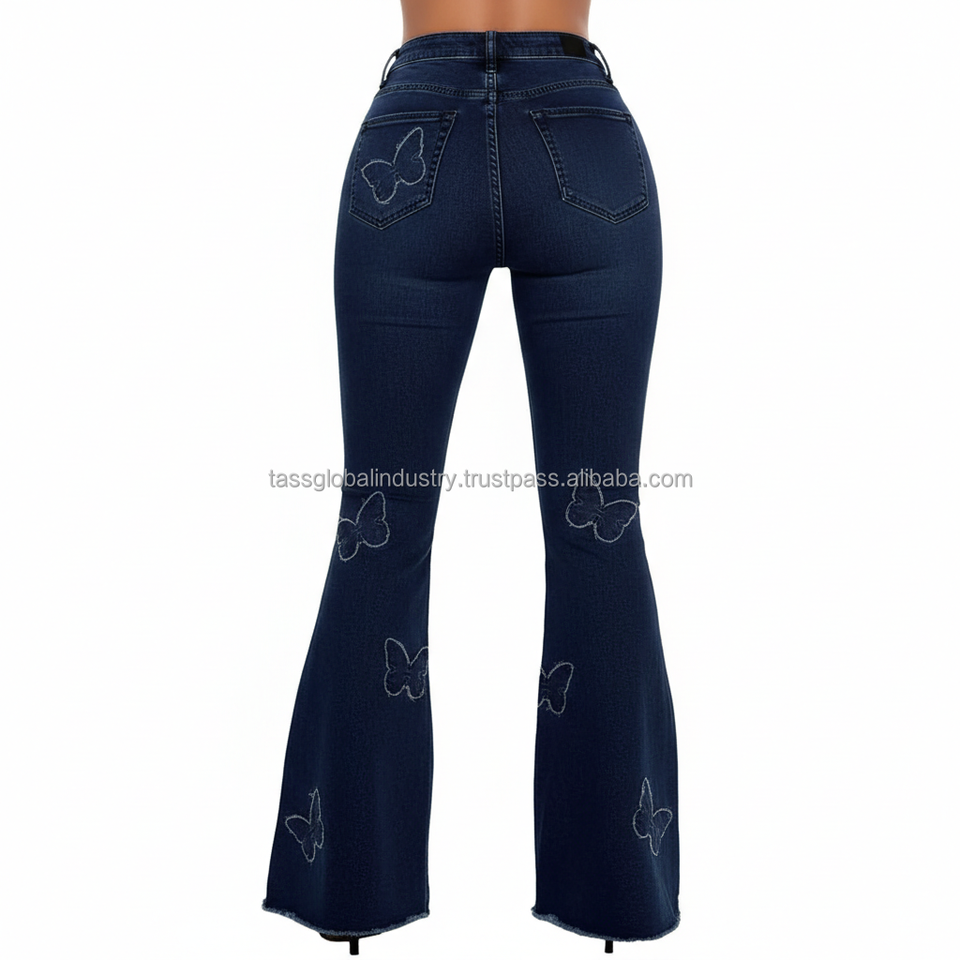 กางเกงยีนส์ทรงบานปักลายผีเสื้อเอวสูงสำหรับผู้หญิง ลดราคาสุดฮอต รุ่นใหม่สุดฮิต สีน้ำเงินเข้ม ขากว้างทรงระฆัง