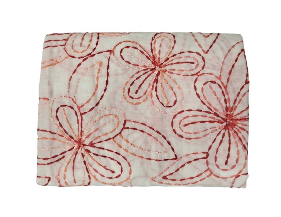 ผ้าฝ้ายสีขาว ปักลายดอกไม้แบบเส้นขอบ