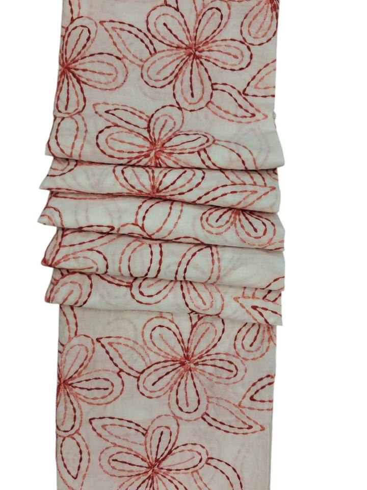 ผ้าฝ้ายสีขาว ปักลายดอกไม้แบบเส้นขอบชนิด