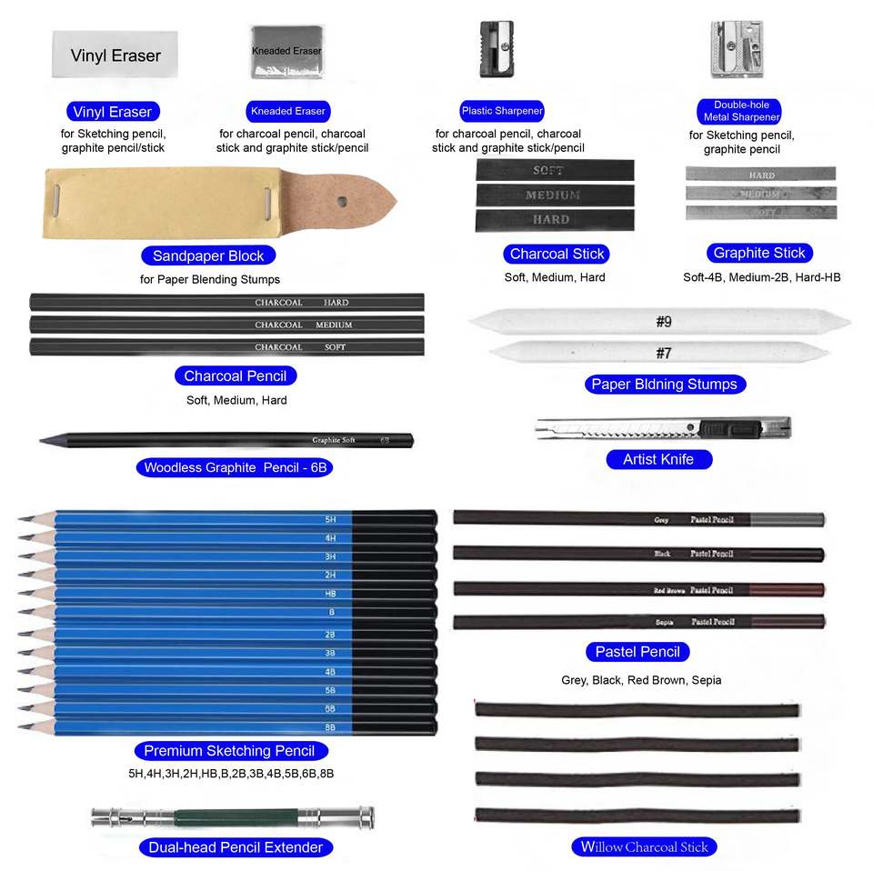 ส่วนประกอบ:ดินสอ, ตอไม้, เครื่องเหลา, แท่งถ่าน