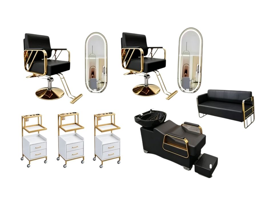 ชุดเฟอร์นิเจอร์ร้านตัดผมสมัยใหม่ สีดำทอง เก้าอี้ตัดผมไฮดรอลิก เตียงสระผม ตู้เก็บของร้านเสริมสวย อุปกรณ์ร้านทำผมครบชุด