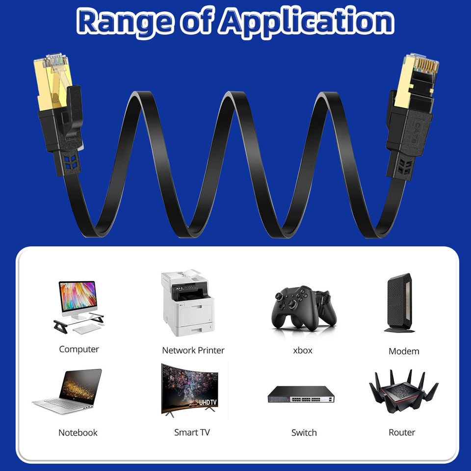 สายแพทช์คอร์ด CAT8 FLAT STP ความเร็วสูง 40Gbps สายทองแดงเปลือย 30AWG สายเน็ตเวิร์ค RJ45 ป้องกันด้วย PVC สายอีเธอร์เน็ต ประเภท 8 ขายดี