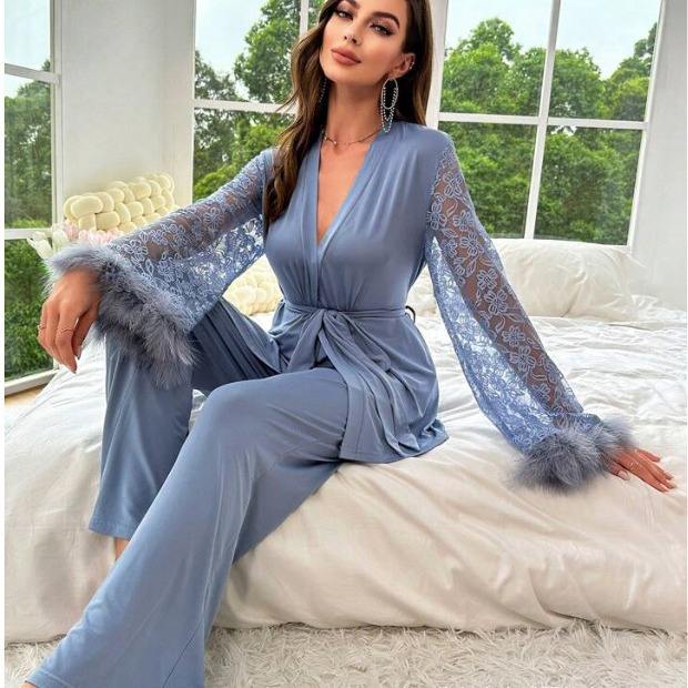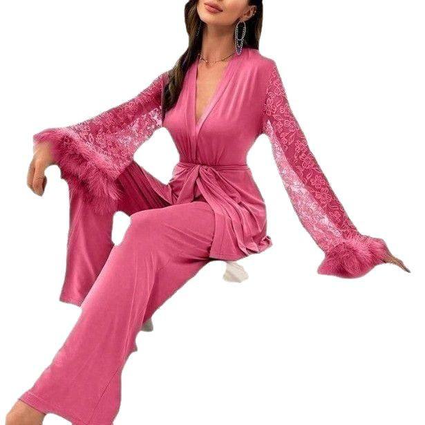 ชุดเสื้อคลุมและกางเกงผ้าลูกไม้สำหรับผู้หญิงชุดเสื้อคลุมแขนยาวแบบลำลองระบายอากาศใส่ในบ้าน