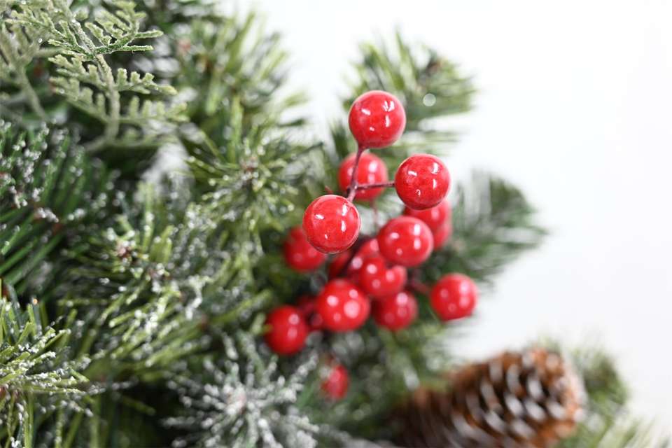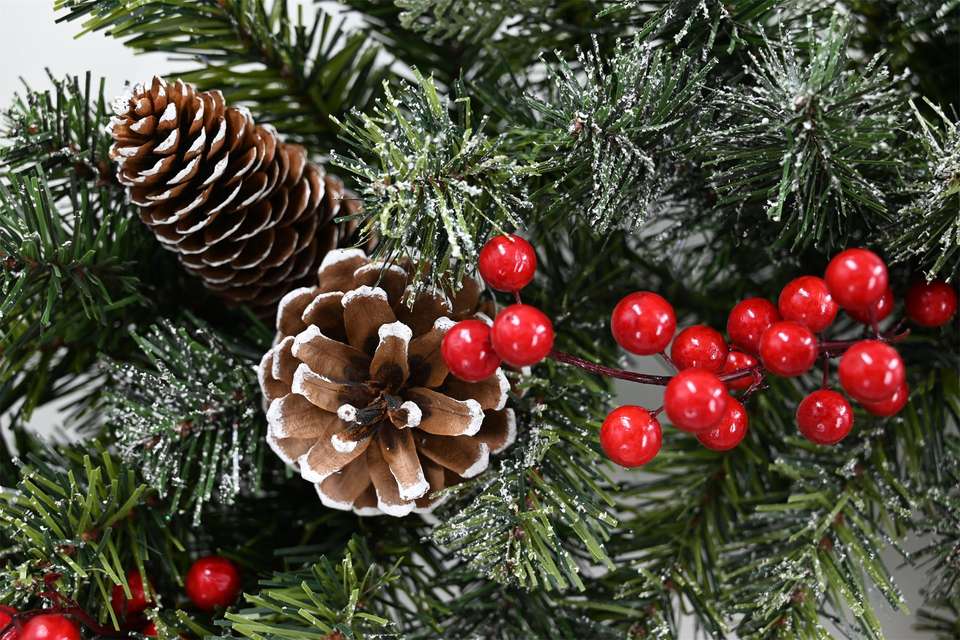 พวงหรีดคริสต์มาสประดิษฐ์แบบทันสมัยเป็นมิตรกับสิ่งแวดล้อม ตกแต่งด้วยโคนต้นสนและผลเบอร์รี่สีแดง ขายดี มีบริการสั่งทำได้