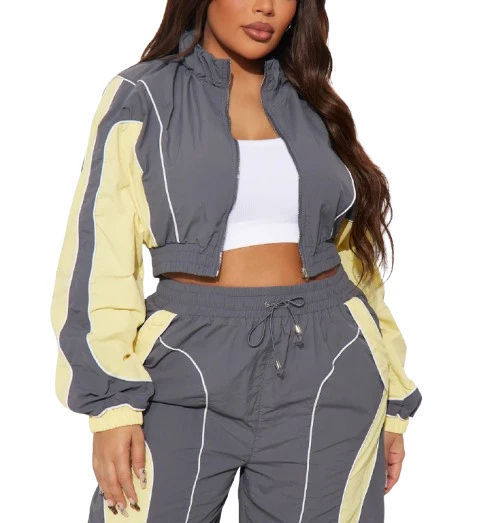 ชุดเซ็ตสองชิ้นสีตัดกันสำหรับผู้หญิง แจ็คเก็ตกันลมสะท้อนแสง สีแดง ขายดี MOQ ต่ำ