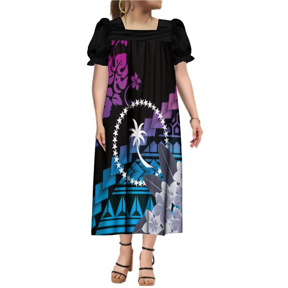 ชุดมูมูไมโครไนซ่าลดราคาสุดฮอต ชุดมูมูชูคผ้าสเตรช ลายชนเผ่าโพลินีเซียน วินเทจ คอเหลี่ยม แขนพองทรงหลวม ความยาวปานกลาง