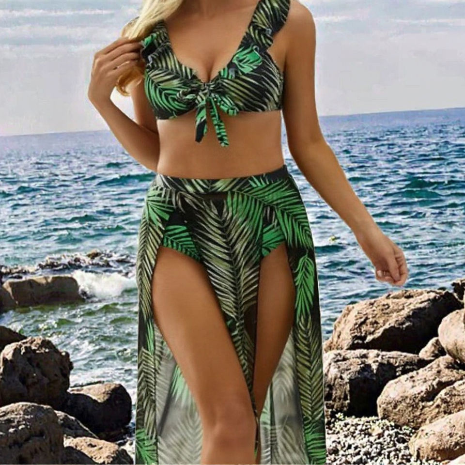 ชุดว่ายน้ำบิกินี่ 3 ชิ้น ลายใบไม้ สีพื้น เซ็กซี่ ไซส์พลัส คอวีไขว้ เอวสูง เป็นมิตรกับสิ่งแวดล้อม ขายดี